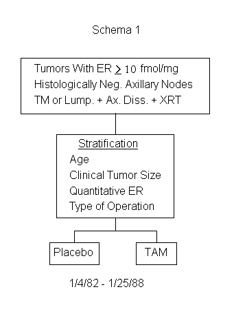 Protocol B-14 A Clinical Trial to Assess Tamoxifen in Patients With Primary Breast Cancer and Negative Axillary Nodes Whose Tumors are Positive for Estrogen Receptors Specific Aims To determine whether tamoxifen is more effective than no treatment with respect to disease-free survival and survival in patients with negative axillary nodes and estrogen-receptor-positive tumors. (See Schema 1) In conjunction with Protocol B-13, this protocol will also permit evaluation of treatment failure and survival in untreated patients relative to their hormone-receptor levels. Protocol B-14 was originally designed to treat patients for a total of 2 years but was subsequently modified to maintain treatment through 5 years. In 1987, an extension of B-14 was initiated to evaluate the effectiveness of tamoxifen for 10 years; specifically, to determine whether an additional 5 years of tamoxifen therapy is effective in prolonging disease-free survival and survival in patients with negative nodes and estrogen-receptor-positive tumors. Patients who complete the initially assigned 5 years of tamoxifen therapy are rerandomized to 5 additional years of either tamoxifen or placebo. (See Schema 2) Randomization for the original protocol objectives was terminated January 25, 1988. From that date until October 17, 1988, all eligible patients were registered to tamoxifen in an effort to enhance the pool of patients eligible for rerandomization at 5 years. At that time protocols B-19 and B-20 opened. ![]() ![]() |