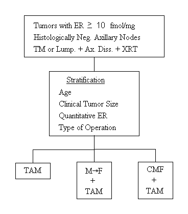 Protocol B-20 A Clinical Trial to Determine the Worth of Chemotherapy and Tamoxifen over Tamoxifen Alone in the Management of Patients with Primary Invasive Breast Cancer, Negative Axillary Nodes and Estrogen-Receptor-Positive Tumors Specific Aims The aims of this study are twofold: to determine whether the addition of combination chemotherapy will improve the benefit of tamoxifen in this group of patients, and, if so, to determine whether an alkylating agent is required when the chemotherapy is given with tamoxifen. Specifically, the study goals are: