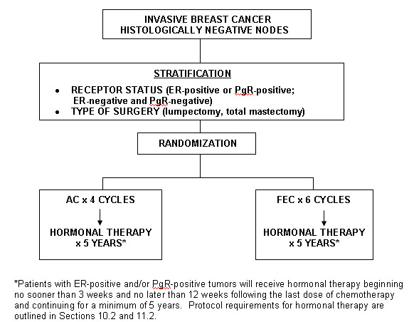 Protocol B-36 A Clinical Trial of Adjuvant Therapy Comparing Six Cycles of 5-Fluorouracil, Epirubicin and Cyclophosphamide (FEC) to Four Cycles of Adriamycin and Cyclophosphamide (AC) in Patients With Node-Negative Breast Cancer Specific Aims The primary aim is to determine superiority among the proposed regimens for prolonging disease-free survival (DFS) in women with node-negative, hormone-receptor-positive or negative breast cancer. ![]() |