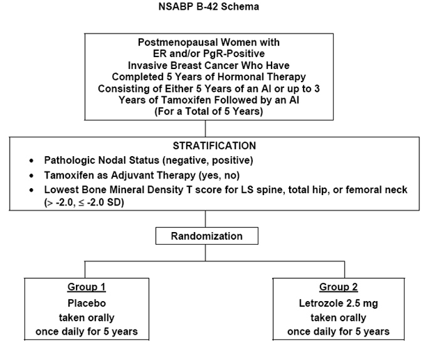 Protocol B-42 A Clinical Trial to Determine the Efficacy of Five Years of Letrozole Compared to Placebo in Patients Completing Five Years of Hormonal Therapy Consisting of an Aromatase Inhibitor (AI) or Tamoxifen Followed by an AI in Prolonging Disease-Free Survival in Postmenopausal Women with Hormone Receptor Positive Breast Cancer Specific Aim To determine whether or not prolonged adjuvant hormonal therapy with letrozole will improve disease-free survival in postmenopausal women with ER-positive and/or PgR-positive tumors who have completed 5 years of hormonal therapy with 5 years of an aromatase inhibitor (AI) or 5 years of a combination of up to 3 years of tamoxifen followed by an AI. ![]() |