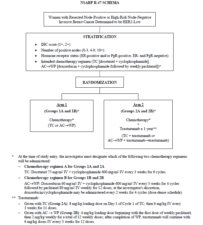 Protocol B-47 A Randomized Phase III Trial of Adjuvant Therapy Comparing Chemotherapy Alone (Six Cycles of Docetaxel Plus Cyclophosphamide or Four Cycles of Doxorubicin Plus Cyclophosphamide Followed by Weekly Paclitaxel) to Chemotherapy Plus Trastuzumab in Women with Node-Positive or High-Risk Node-Negative HER2-Low Invasive Breast Cancer Specific Aim To determine whether the addition of trastuzumab to chemotherapy (TC or AC→WP) improves invasive disease-free survival (IDFS) in women with resected node-positive or high-risk node-negative breast cancer which is reported as HER2-low by all HER2 testing performed. ![]() |
