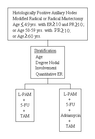 Protocol B-12 A Protocol to Compare L-PAM, 5-FU and Tamoxifen With and Without Adriamycin in the Management of Primary Breast Cancer Patients With Positive Axillary Nodes Whose Tumors are Positive for Estrogen and/or Progesterone Receptors Specific Aims To determine whether L-PAM + Adriamycin + 5-FU + tamoxifen (PAFT) is more effective than L-PAM + 5-FU + tamoxifen (PFT) in disease-free survival and survival of patients with one or more positive nodes whose tumors are estrogen-receptor (ER) positive and/or progesterone-receptor (PR) positive. ![]() |