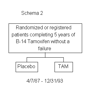 Protocol B-14 A Clinical Trial to Assess Tamoxifen in Patients With Primary Breast Cancer and Negative Axillary Nodes Whose Tumors are Positive for Estrogen Receptors Specific Aims To determine whether tamoxifen is more effective than no treatment with respect to disease-free survival and survival in patients with negative axillary nodes and estrogen-receptor-positive tumors. (See Schema 1) In conjunction with Protocol B-13, this protocol will also permit evaluation of treatment failure and survival in untreated patients relative to their hormone-receptor levels. Protocol B-14 was originally designed to treat patients for a total of 2 years but was subsequently modified to maintain treatment through 5 years. In 1987, an extension of B-14 was initiated to evaluate the effectiveness of tamoxifen for 10 years; specifically, to determine whether an additional 5 years of tamoxifen therapy is effective in prolonging disease-free survival and survival in patients with negative nodes and estrogen-receptor-positive tumors. Patients who complete the initially assigned 5 years of tamoxifen therapy are rerandomized to 5 additional years of either tamoxifen or placebo. (See Schema 2) Randomization for the original protocol objectives was terminated January 25, 1988. From that date until October 17, 1988, all eligible patients were registered to tamoxifen in an effort to enhance the pool of patients eligible for rerandomization at 5 years. At that time protocols B-19 and B-20 opened. ![]() ![]() |