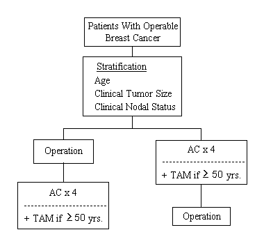 Protocol B-18 A "Unified" Trial to Compare Short, Intensive Preoperative Systemic Adriamycin-Cyclophosphamide Therapy with Similar Therapy Administered in Conventional Postoperative Fashion Specific Aims To determine whether four courses of preoperative chemotherapy will more effectively prolong disease-free survival and survival than do four courses of the same chemotherapy (Adriamycin and cyclophosphamide) given postoperatively. ![]() |