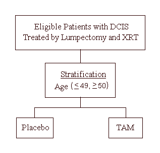 Protocol B-24 A Clinical Trial to Evaluate the Worth of Tamoxifen in Conjunction with Lumpectomy and Breast Irradiation for the Treatment of Noninvasive Intraductal Carcinoma (DCIS) of the Breast Specific Aims The specific aim for this protocol is to determine, for patients with noninvasive intraductal cancer (DCIS), whether lumpectomy and postoperative breast irradiation plus prolonged tamoxifen therapy is more effective than lumpectomy and breast irradiation without tamoxifen in preventing the subsequent occurrence of ipsilateral and contralateral breast cancers ![]() |