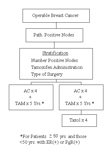Protocol B-28 A Randomized Trial Comparing the Worth of Paclitaxel (Taxol) Following Doxorubicin (Adriamycin) /Cyclophosphamide in Breast Cancer Patients With Positive Axillary Nodes Specific Aims The primary aim of this study is to determine whether four cycles of Taxol given after four cycles of postoperative AC will more effectively prolong disease-free survival and survival than do four cycles of AC alone, in patients with operable breast cancer who have one or more histologically positive axillary lymph nodes. ![]() |