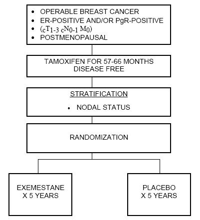 Protocol B-33 A Randomized, Placebo-Controlled, Double-Blind Trial Evaluating The Effect Of Exemestane In Clinical Stage T1-3 N0-1 M0 Postmenopausal Breast Cancer Patients Completing At Least Five Years Of Tamoxifen Therapy Specific Aims The primary aim of this randomized, placebo-controlled, double-blind clinical trial is to determine whether oral administration of exenestane, for 2 years, in postmenopausal patients with estrogen-receptor-positive (ER+) and/or progesterone-receptor-positive (PgR+) breast cancer (cT1-3 cN0-1 M0) who have completed 5 years of tamoxifen therapy, will prolong disease-free survival when compared with placebo. Secondary aims of this study are to determine whether administration of 2 years of exemestane following 5 years of tamoxifen therapy is more effective than giving 5 years of tamoxifen alone in prolonging overall survival and time to treatment failure. ![]() |