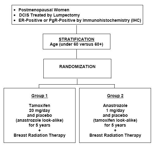 Protocol B-35 A Clinical Trial Comparing Anastrozole with Tamoxifen in Postmenopausal Patients with Ductal Carcinoma In Situ (DCIS) Undergoing Lumpectomy with Radiation Therapy Specific Aims The primary aim of this Phase III trial is to compare the value of 1 mg/day of anastrozole to 20 mg/day of tamoxifen, each given for 5 years, in preventing the subsequent occurrence of breast cancer (local, regional and distant recurrences, and contralateral breast cancer) following lumpectomy with radiation therapy in postmenopausal women with ductal carcinoma in situ (DCIS). ![]() |