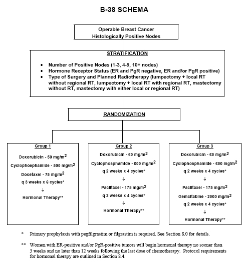 Protocol B-38 A Phase III, Adjuvant Trial Comparing Three Chemotherapy Regimens in Women With Node-Positive Breast Cancer: Docetaxel/Doxorubicin/Cyclophosphamide (TAC); Dose-Dense (DD) Doxorubicin/Cyclophosphamide Followed by DD Paclitaxel (DD AC → P); DD AC Followed by DD Paclitaxel Plus Gemcitabine (DD AC → PG) Specific Aims The primary aims of the study are to determine whether the DD AC → PG regimen is superior to the TAC regimen as well as to the DD AC → P regimen in improving disease-free survival (DFS) and to compare the relative DFS of TAC and DD AC → P. ![]() |