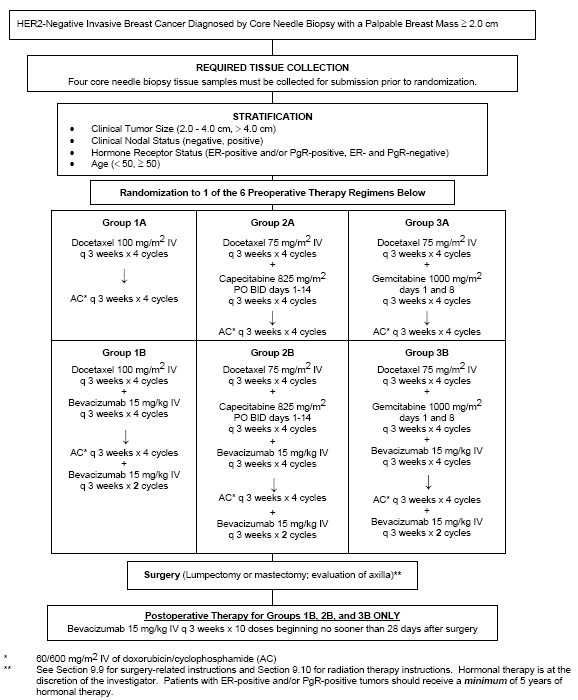 Protocol B-40 A Randomized Phase III Trial of Neoadjuvant Therapy in Patients with Palpable and Operable Breast Cancer Evaluating the Effect on Pathologic Complete Response (pCR) of Adding Capecitabine or Gemcitabine to Docetaxel when Administered Before AC with or without Bevacizumab and Correlative Science Studies Attempting to Identify Predictors of High Likelihood for pCR with Each of the Regimens Specific Aims The primary aims of this Phase III study are to determine whether adding capecitabine or gemcitabine to docetaxel followed by AC will increase the pathologic complete response (pCR) rates in patients with palpable and operable HER2-negative breast cancer and to determine whether the addition of bevacizumab to three docetaxel-based regimens followed by AC will increase pCR rates. ![]() |
