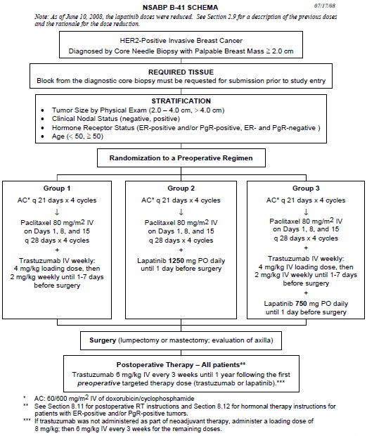 Protocol B-41 A Randomized Phase III Trial of Neoadjuvant Therapy for Patients with Palpable and Operable HER2-Positive Breast Cancer Comparing the Combination of Trastuzumab Plus Lapatinib to Trastuzumab and to Lapatinib Administered with Weekly Paclitaxel Following AC Accompanied by Correlative Science Studies to Identify Predictors of Pathologic Complete Response Specific Aims The primary aims of this study are to determine whether the regimen of AC → weekly paclitaxel (WP) plus trastuzumab plus lapatinib yields a greater rate of pCR than the regimen of AC → WP plus trastuzumab and to determine whether the regimen of AC → WP plus lapatinib yields a greater rate of pCR than the regimen of AC → WP plus trastuzumab. ![]() |