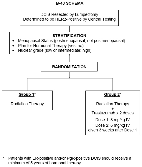Protocol B-43 A Phase III Clinical Trial Comparing Trastuzumab Given Concurrently with Radiation Therapy and Radiation Therapy Alone for Women with HER2-Positive Ductal Carcinoma In Situ Resected by Lumpectomy Specific Aim To determine the value of trastuzumab given during radiation therapy (RT) compared to RT alone in preventing the subsequent occurrence of ipsilateral breast cancer recurrence, ipsilateral skin cancer recurrence, or ipsilateral DCIS (IIBCR-SCR-DCIS) in women with HER2-positive DCIS resected by lumpectomy. ![]() |