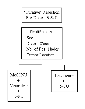 Protocol C-03 A Clinical Trial to Compare Adjuvant Leucovorin and 5-FU (LV+5FU) with Adjuvant MeCCNU, Vincristine and 5-FU (MOF), in Patients with Dukes' B and C Carcinoma of the Colon Specific Aims The primary purpose of this study is to determine whether adjuvant therapy with combination 5-fluorouracil and leucovorin is more effective than MeCCNU, VCR and 5-FU in prolonging disease-free survival and survival in patients undergoing curative resection of adenocarcinoma of the colon. ![]() |
