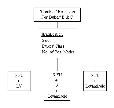 Protocol C-04 A Clinical Trial to Assess the Relative Efficacy of 5-FU + Leucovorin, 5-FU + Levamisole, and 5-FU + Leucovorin + Levamisole in Patients with Dukes' B and C Carcinoma of the Colon Specific Aims In patients who have undergone a "curative" resection of a Dukes' B or C carcinoma of the colon, to determine if the addition of levamisole to leucovorin-modulated 5-FU provides an additional benefit in regard to disease-free survival and survival and, if so, to assess whether this benefit is superior to that achieved by administration of 5-FU + levamisole. The study will also evaluate whether 5-FU administered with levamisole is superior to leucovorin-modulated 5-FU. ![]() |