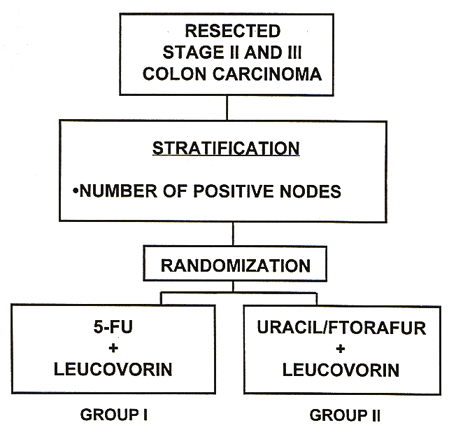Protocol C-06 A Clinical Trial Comparing Oral Uracil/Ftorafur (UFT) Plus Leucovorin (LV) With 5Fluorouracil (5FU) Plus LV In The Treatment Of Patients With Stages II And III Carcinoma Of The Colon Specific Aims This study will evaluate the relative efficacy of two postoperative chemotherapy regimens in patients with resected stages II and III carcinoma of the colon: 1) 5fluorouracil (5FU) plus highdose leucovorin (LV) and 2) Uracil/Ftorafur (UFT) plus LV. Patients will be stratified according to number of positive nodes. ![]() |