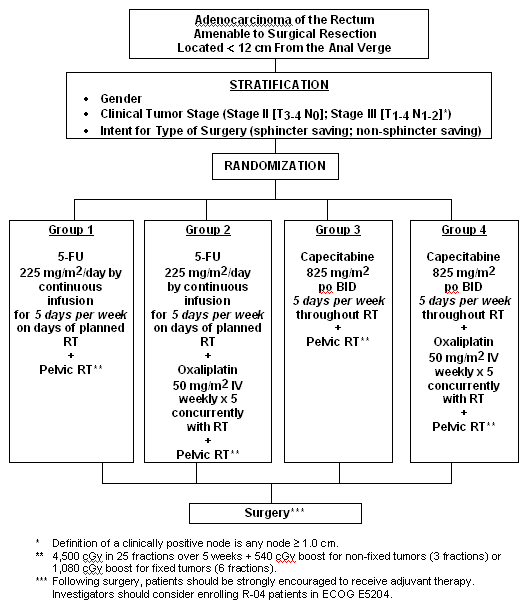 - Compare the rate of local-regional relapse in patients receiving preoperative oral capecitabine + radiotherapy (RT) to that in patients receiving preoperative continuous intravenous infusion (CVI) 5-FU + RT;